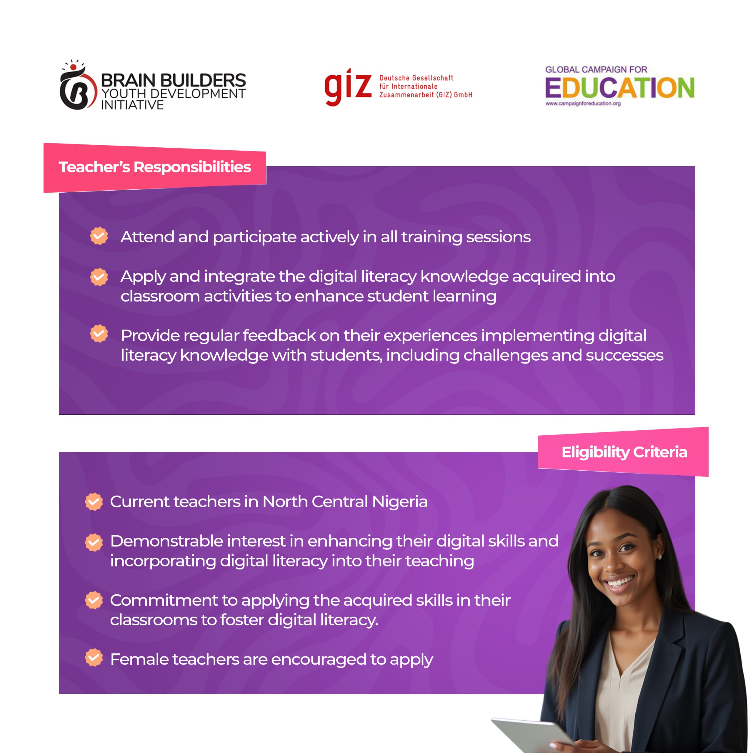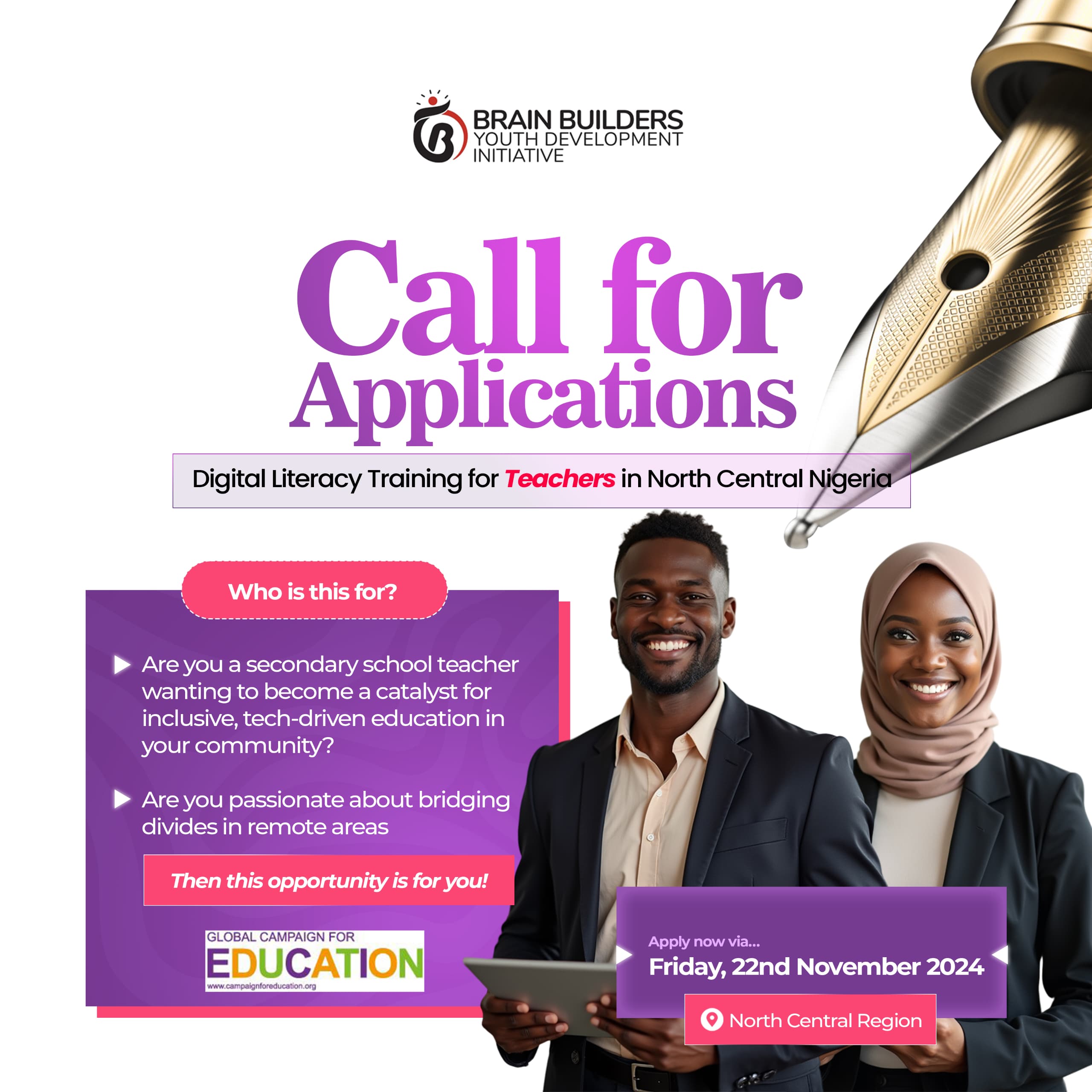 The Brain Builders Youth Development Initiative is receiving applications from secondary school teachers in North Central Nigeria aspiring to become catalysts for inclusive, tech-driven education in their communities to apply for its Digital Literacy Training For Teachers.