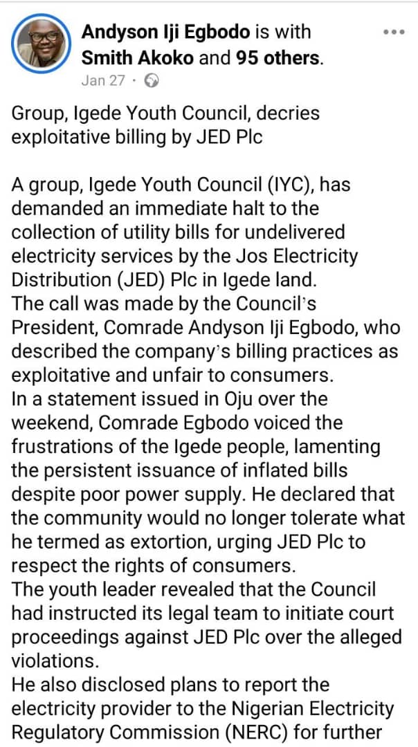 In response to the situation, the Igede Youth Council has written to the Jos Electricity Distribution Company (JEDC) and Agba Community Radio at Oju, expressing their grievances. They have also threatened legal action if nothing is done to address the crisis.